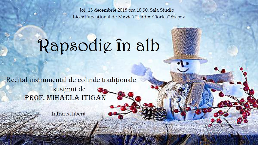 Sâmbătă 14.12.2013, începând cu ora 1700 Patinoarul Olimpic Braşov va fi gazda acestui eveniment care include muzică instrumentală, vocală şi percuţie, interpretată de soliştii şi grupurile de elevi de la liceul nostru, sub îndrumarea profesorilor acestora. Atmosfera va fi completată de dansul pe gheaţă al mai multor sportivi de la Clubul Corona Braşov. Spectacolul se va încheia cu cele mai îndrăgite colinde româneşti şi internaţionale. Evenimentul este organizat de Liceul de Muzică"Tudor Ciortea", în parteneriat cu A.S.C. Corona Braşov, Inspectoratul Şcolar Braşov şi Primăria Braşov şi este dedicat Fundaţiei HOSPICE Casa Speranţei. Intrarea la spectacol se face contra sumei de 5 lei, iar biletele au fost puse în vânzare la sediul HOSPICE Braşov (strada Sitei nr.17A) şi vor putea fi achiziţionate şi de la Patinoarul Olimpic Braşov, în seara evenimentului.
